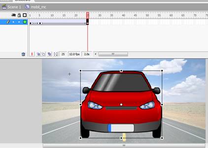 10.Insert keyframe di frame ke 25. Ubah ukuran mobil menjadi besar. Kemudian Create Motion Tween