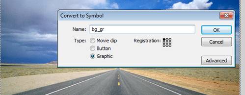 3. Klik kanan gambar jalan tersebut, kemudian pilih Convert to Symbol. Beri nama bg_gr dengan tipe simbol adalah graphic, klik OK
