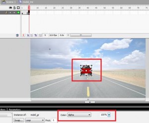 8.Klik kanan, insert key frame di frame ke 5. Kemudian ubah property alpha menjadi 100% dan ubah ukuran mobil menjadi mengecil (gunakan transform tool)