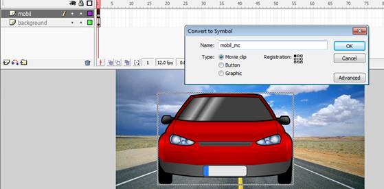 5. Impor gambar mobil ke dalam layer mobil. Convert to symbol gambar mobil tsb dan beri nama mobil_mc pilih tipe symbol Movie Clip