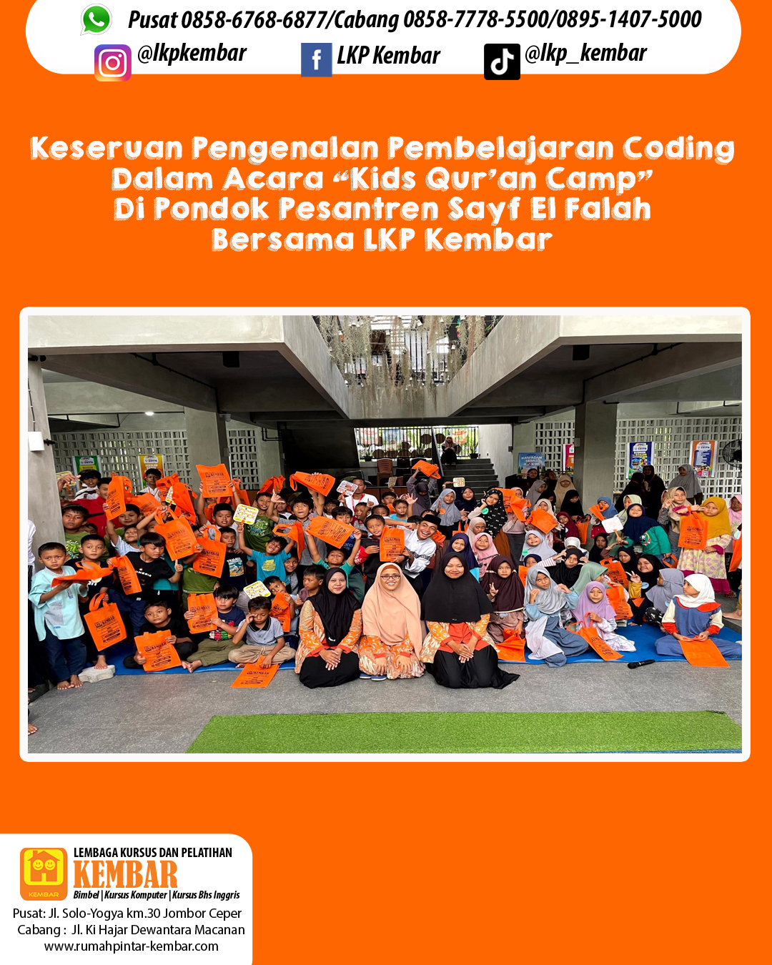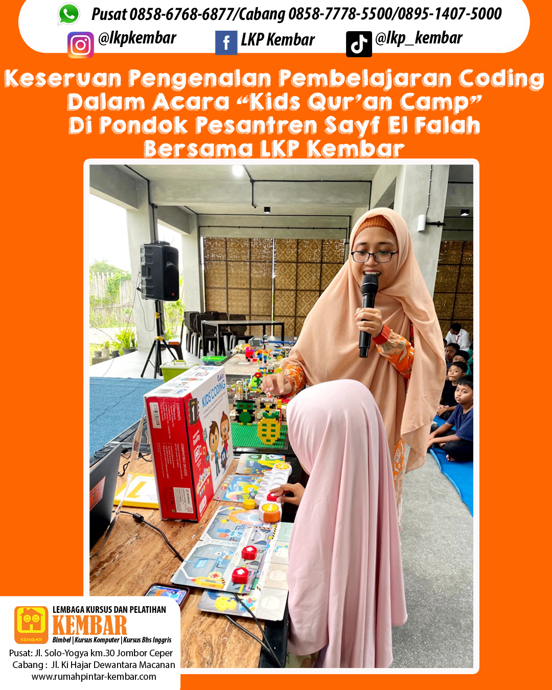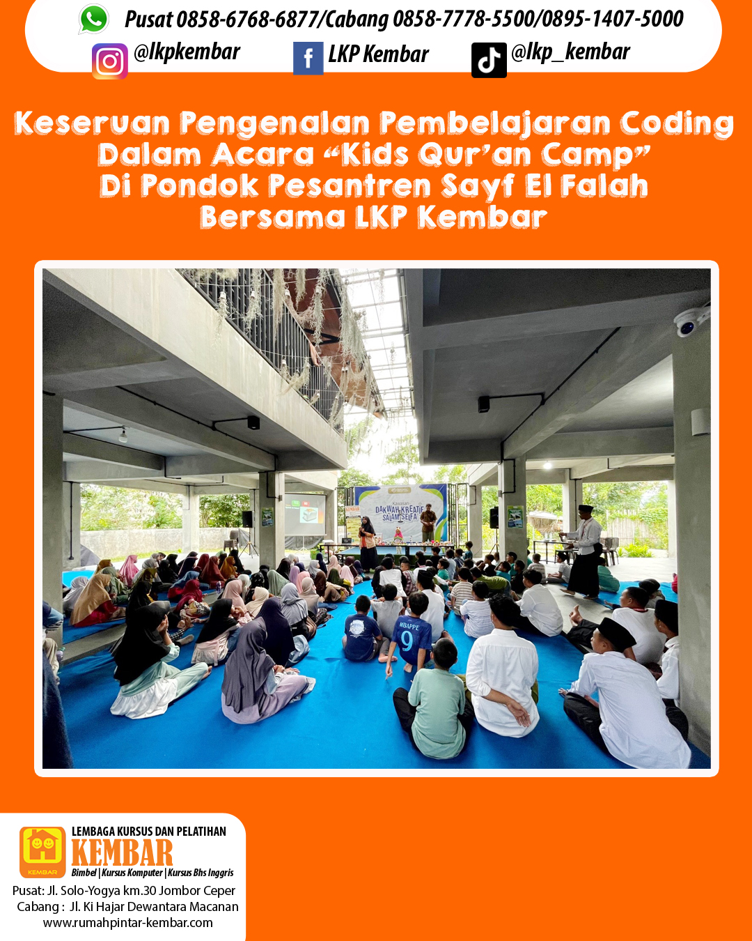 Melalui kegiatan Kids Qur’an Camp di Pondok Pesantren Sayf El Falah, LKP Kembar memperkenalkan dasar-dasar coding dengan cara seru dan menyenangkan 💻📘