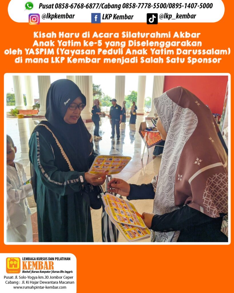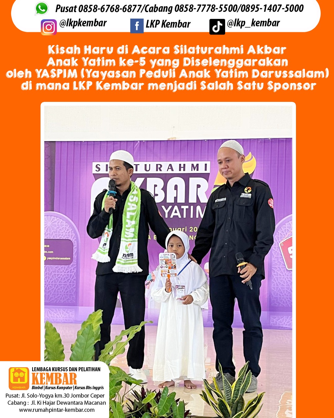 Alhamdulillah, 04 Januari lalu terlaksana Acara Silaturahmi Akbar Anak Yatim ke-5 yang Diselenggarakan oleh YASPIM (Yayasan Peduli Anak Yatim Darussalam) di mana LKP Kembar menjadi Salah Satu Sponsor.