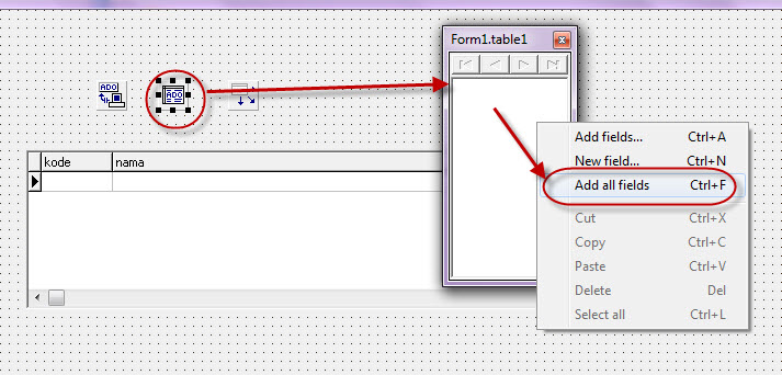 – ambil ADOConnection dan ADOTable dan masukkan ke dalam form