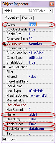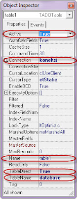 – name digunakan untuk merubah nama ADOTabel yang digunakan dalam program, pada gambar diatas name diubah menjadi table1