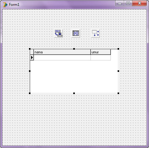 – dbgrig adalah tampilan interface berupa table, namun karena belum diisi maka tampilan dbgrid masih kosong seperti pada gambar
