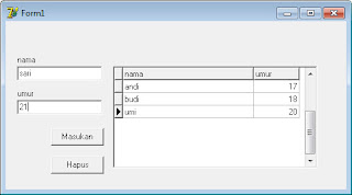 – selanjutnya dibuat 2 buah tombol untuk melakukan insert data dan delete data pada table dan hasilnya dapat langsung dilihat pada dbgrid.