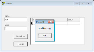 listing ini digunakan untuk melakukan pengecekan kondisi table1 apakah kosong atau masih ada data di dalamnya, hal ini dilakukan untuk mencegah terjadinya error saat melakukan penghapusan tecord namun tidak ditemukan data. karena itu dengan listing ini maka saat tidak ada data di dalam table akan muncul pesan peringatan.