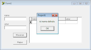 untuk melakukan pengisian data diperlukan 2 buah data yang diinputkan yaitu data nama dan umur karena itu untuk menghindari terjadinya error maka pada awal dituliskan listing: