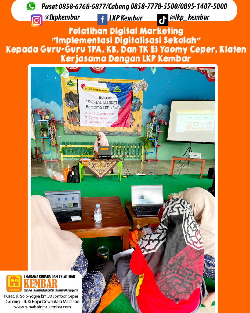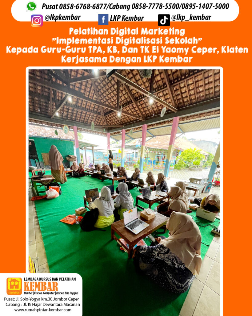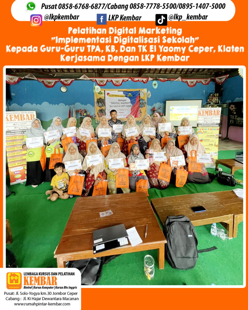 Melalui Pelatihan Digital Marketing: Implementasi Digitalisasi Sekolah, para guru dari TPA, KB, dan TK EI Yaomy Ceper, Klaten dibekali berbagai keterampilan digital mulai dari: