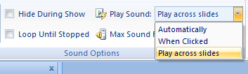 11. Klik ganda icon terebut. Pada Group Sound Option, di field Play Sound, pilih Play across slides agar lagu yang Anda masukkan tetap diputar meskipun berpindah slide dari halaman satu ke halaman lainnya.