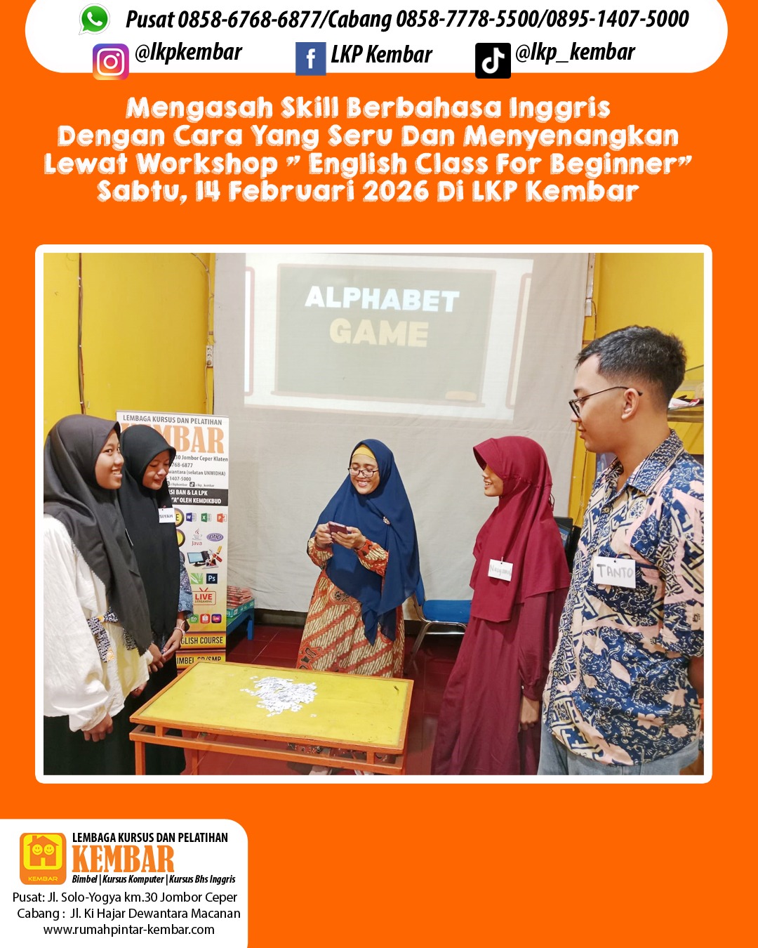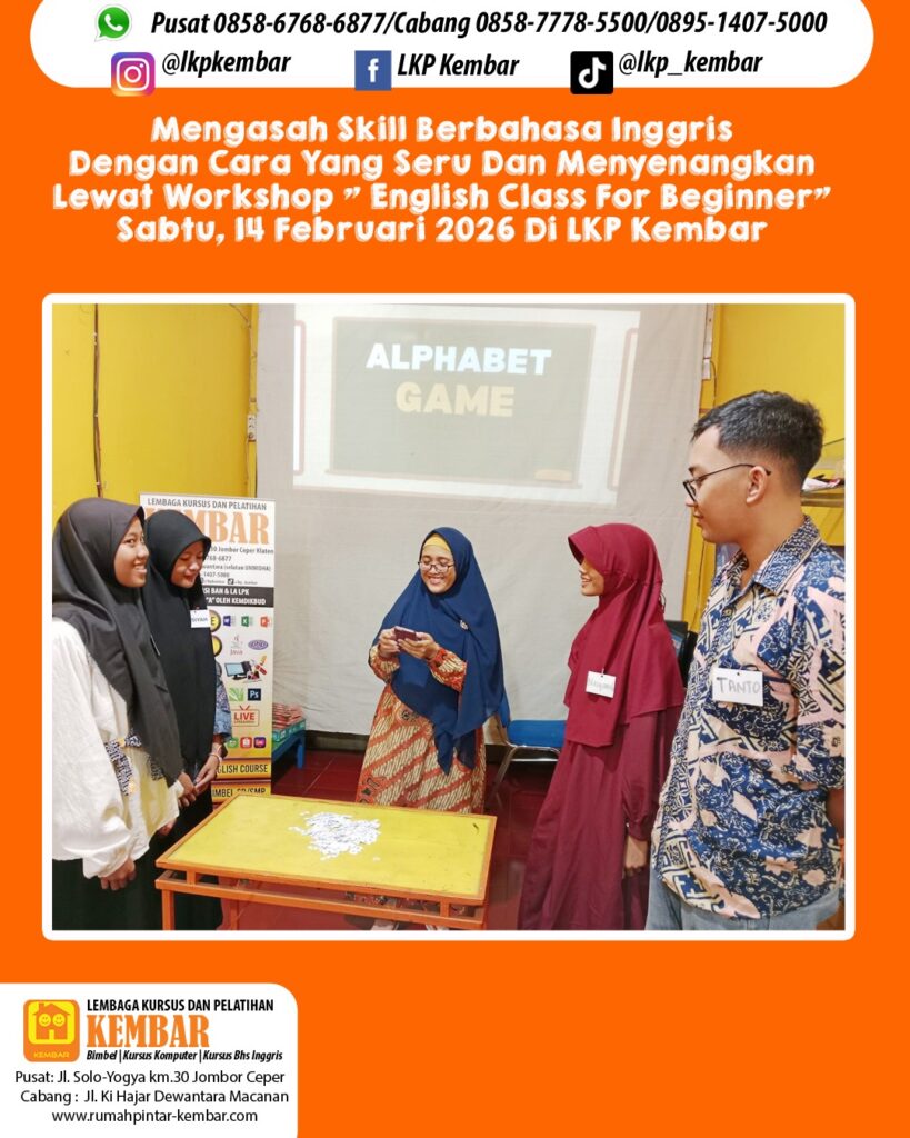 Sabtu, 14 Februari 2026 kemarin, LKP Kembar sukses mengadakan workshop “English Class for Beginner”. Suasana kelas dibuat santai, seru, dan interaktif, jadi peserta bisa lebih percaya diri buat mulai speaking, nambah vocabulary, dan praktik langsung bareng teman-teman 🙌📚